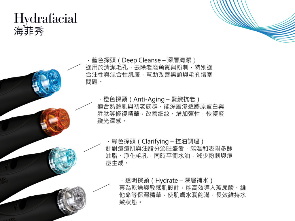 海菲秀採用HydroPeel™ 水磨探頭,其獨特設計能深入毛孔溫和清潔,同時避免對肌膚造成刺激。搭配多種客製化精華,可依個人膚況調整,提供最適合的養護效果。